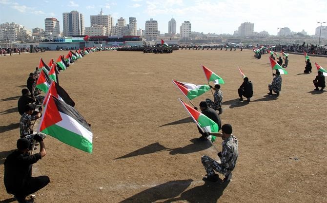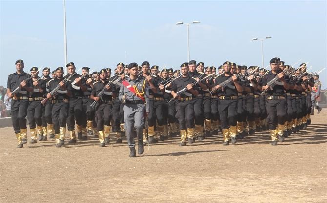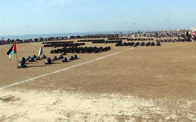 مع نسائم هواء بحرها العليل, وأصوات أمواجه الهادئة, وعلى أنغام الأناشيد الحماسية وقرع الطبول, وصخب الموسيقى العسكرية واندماجها بهتافات الجماهير المحتشدة على أرض "ميناء مدينة غزة البحري" رفرفت الأعلام الفلسطينية وشكل أكثر من 1000 ضابطا وضابط صف من خرجي فوج شهداء "معركة العصف المؤكول" بأجسادهم لوحة فنية وطنية مميزة.