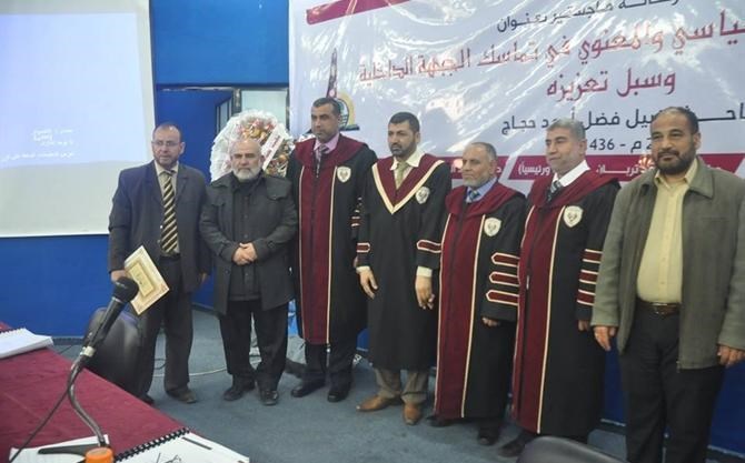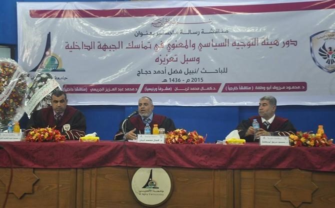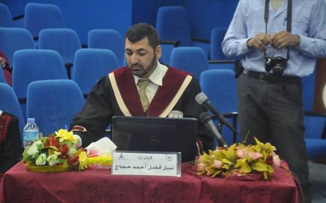 حصل أ. نبيل حجاج من مرتبات هيئة التوجيه السياسي والمعنوي على درجة ماجستير في تخصّص القيادة والإدارة بعد المناقشة العلنية التي جرت في قاعة المؤتمرات في جامعة الأقصى بمدينة غزة.