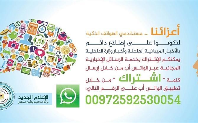أطلق المكتب الإعلام التابع لوزارة الداخلية والأمن الوطني خدمة الرسائل الإخبارية المجانية عبر موقع التواصل الاجتماعي الواتس آب لكافة مستخدمي الأجهزة الزكية.