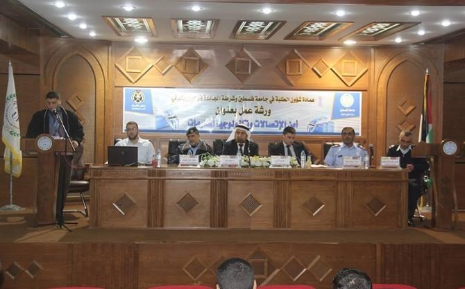 نظمت شرطة أمن الجامعات بالمحافظة الوسطى ورشة عمل لطلاب جامعة فلسطين في مدينة الزهراء بالمحافظة بعنوان "أمن الاتصالات وتكنولوجيا المعلومات "