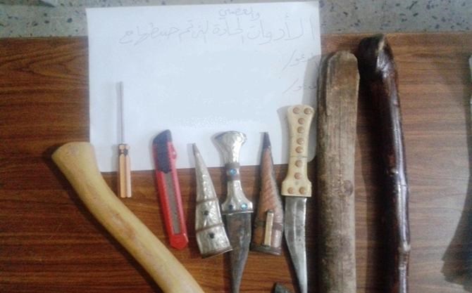وأضاف: " قامت القوة بملاحقتهم لمسافة أكثر من 2 كيلومتر , وبعد القبض عليهم تبين وجود سلاح أبيض بحوزتهم (خنجر عدد2 وبلطة ومنشتر ومفك وعصي)".