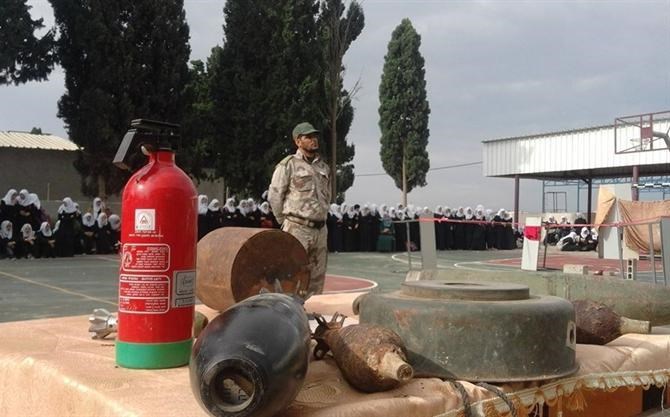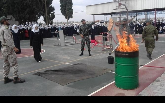 واشتملت الفعالية على مناورة تدريبية لطالبات المدرسة في مهارات إطفاء الحرائق والتعامل مع الأجسام المشبوهة والإسعافات الأولية.