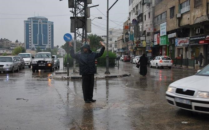 رقيب أول "محمد أبو ريالة" أحد عناصر شرطة المرور يقف تحت الإشارة الضوئية على مفترق السرايا - الأكثر حركةً وازدحاماً بغزة - مُلوحاً بيده منظماً حركة السير ومتابعاً مرور السيارات والمشاة رغم تواصل هطول الأمطار الغزيرة.