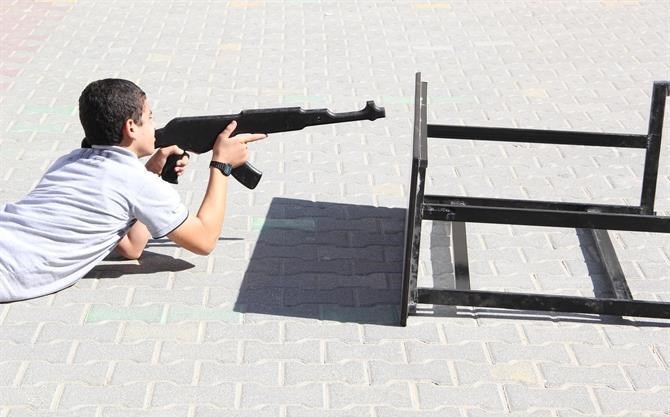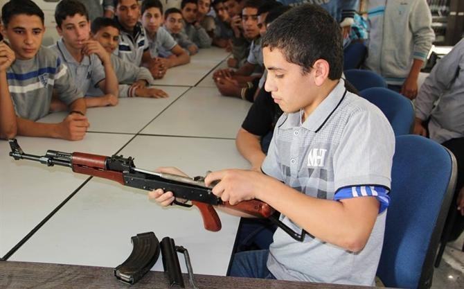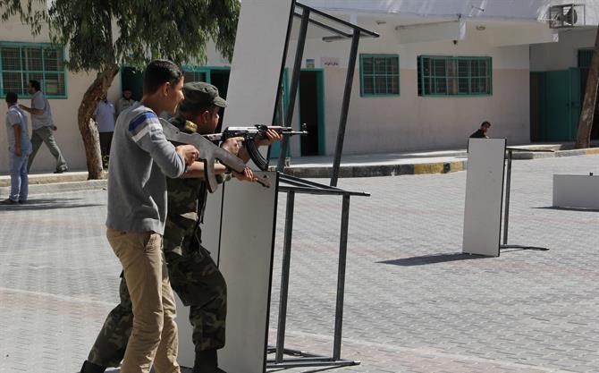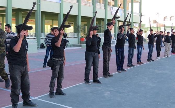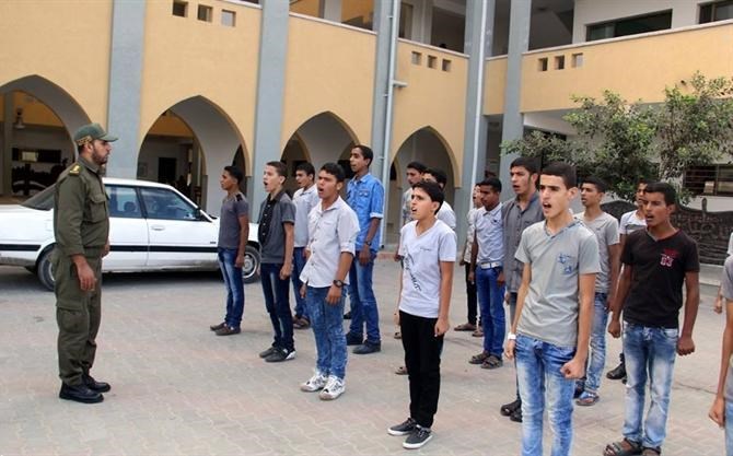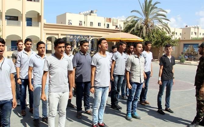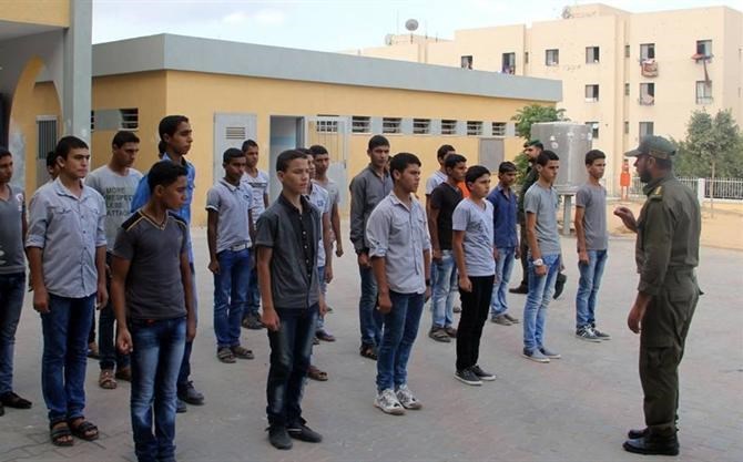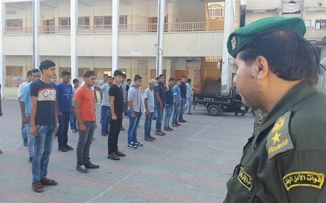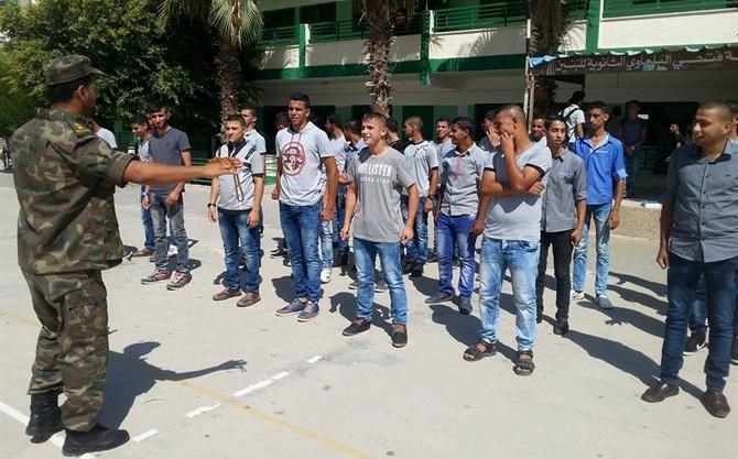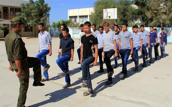 ما نتحدث عنه ليس في موقع عسكري ولا معسكر تدريب بمراكز الشرطة، وإنما في مدرسة التقوى الثانوية للبنين غرب مدينة غزة ضمن برنامج الفتوة الذي يشرف عليه جهاز الأمن الوطني بالتعاون مع وزارة التربية والتعليم.
