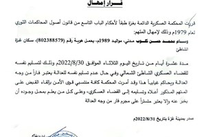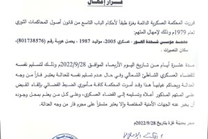المحكمة العسكرية تمهل المتهم الشنتف عشرة أيام لتسليم نفسه