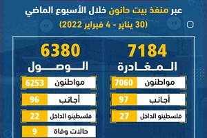 7184 مغادراً و6380 وافداً عبر منفذ بيت حانون الأسبوع الماضي