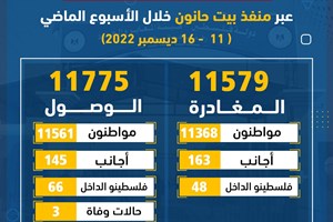 11579 مغادراً و11775 وافداً عبر منفذ بيت حانون الأسبوع الماضي